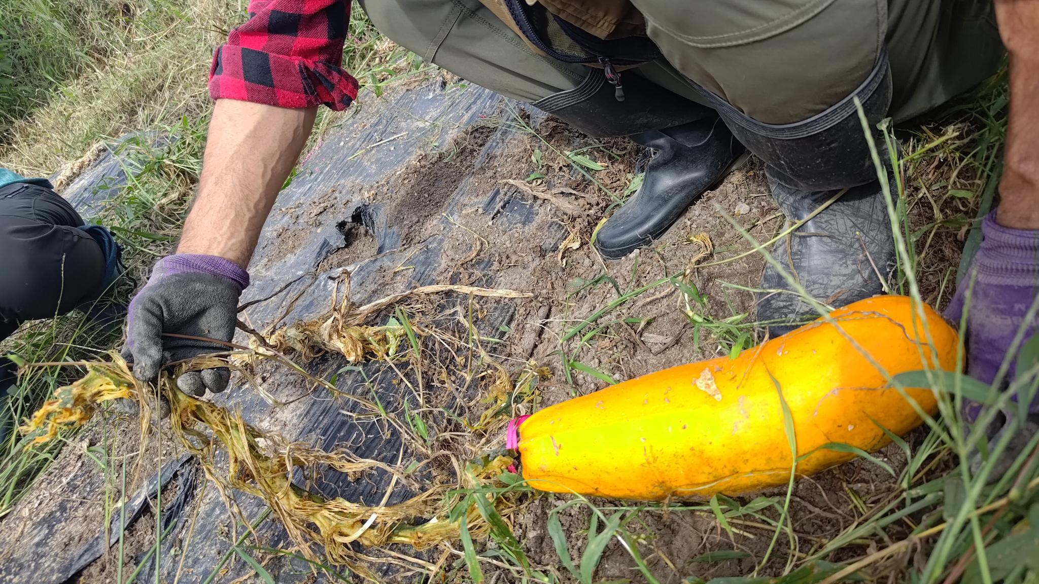 ズッキーニはカボチャの仲間なので、種の洗い以降の手順は同じですが、食べごろのズッキーニでは種が成熟していないので、種採り用の果実は印をして茎にならせたままにし、表面がしなびるくらいまで待ちます。