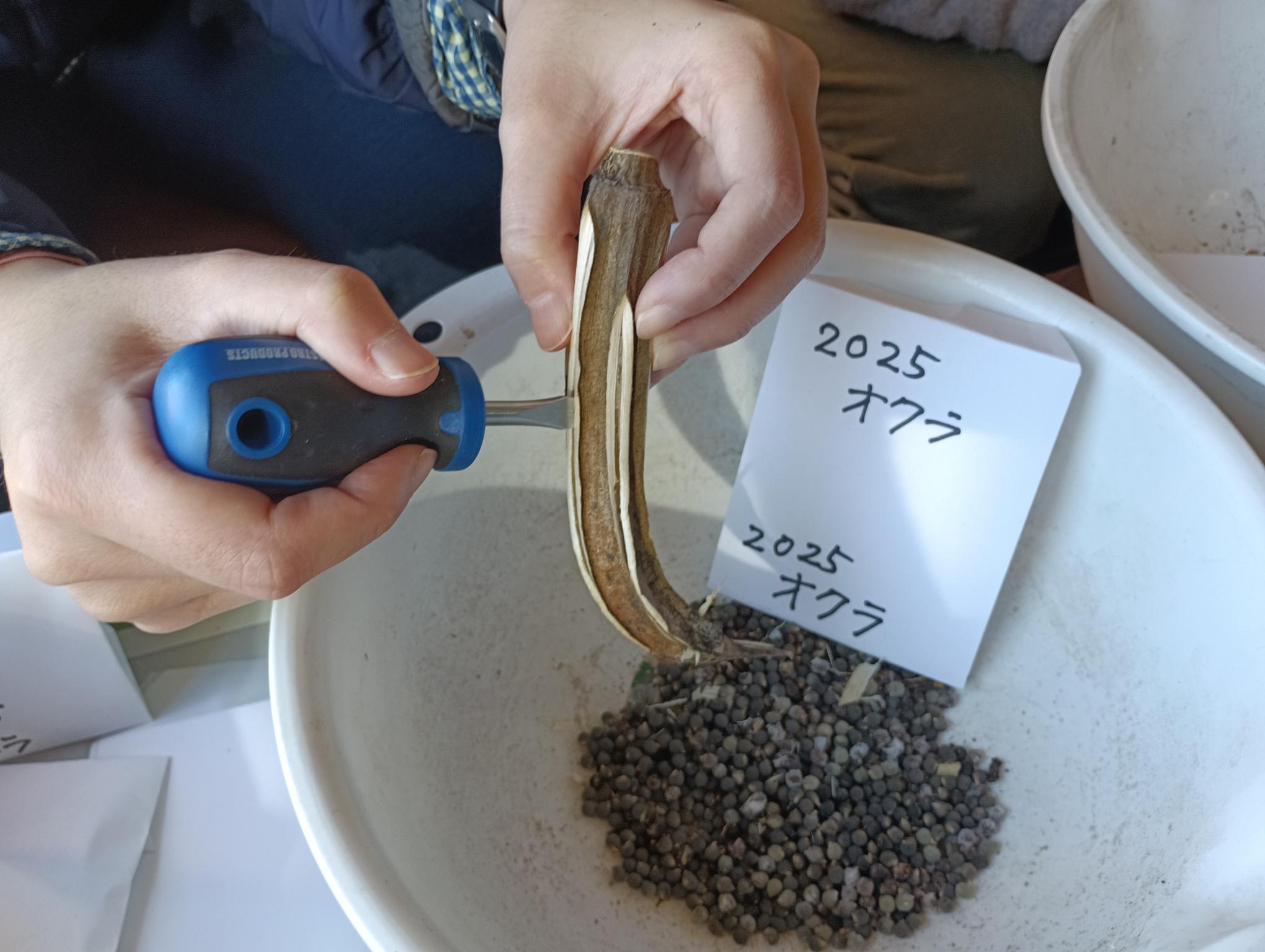 ある程度乾燥させているサヤがたまったところで、マイナスドライバーを使って割れ目を広げ、種をスライドさせながら押し出します。
