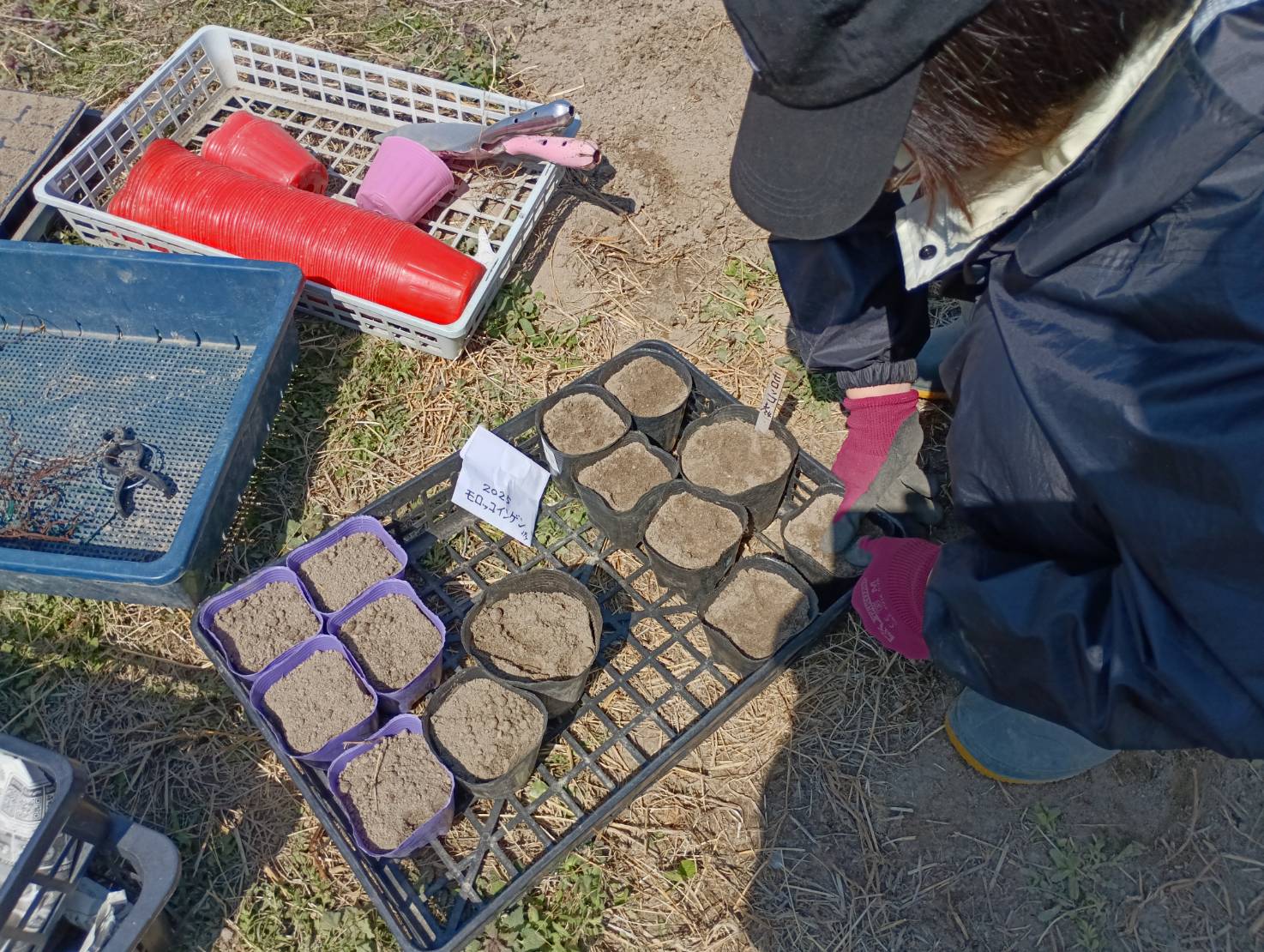 ポット枡の中央に一つ穴を開け、二粒づつ種を入れ軽く土をかけて押さえます。