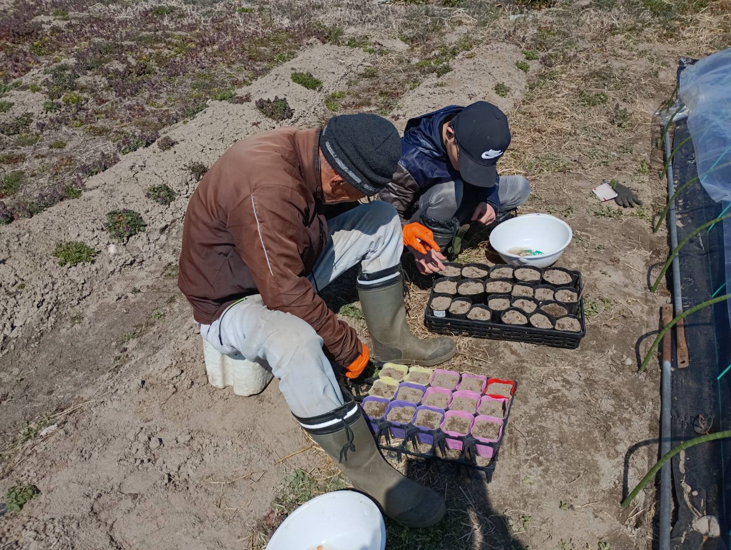 今シーズンはオオニラの育成を広げようということで、昨年自家採りした種を連結ポットに蒔きました。