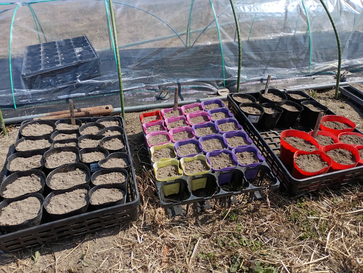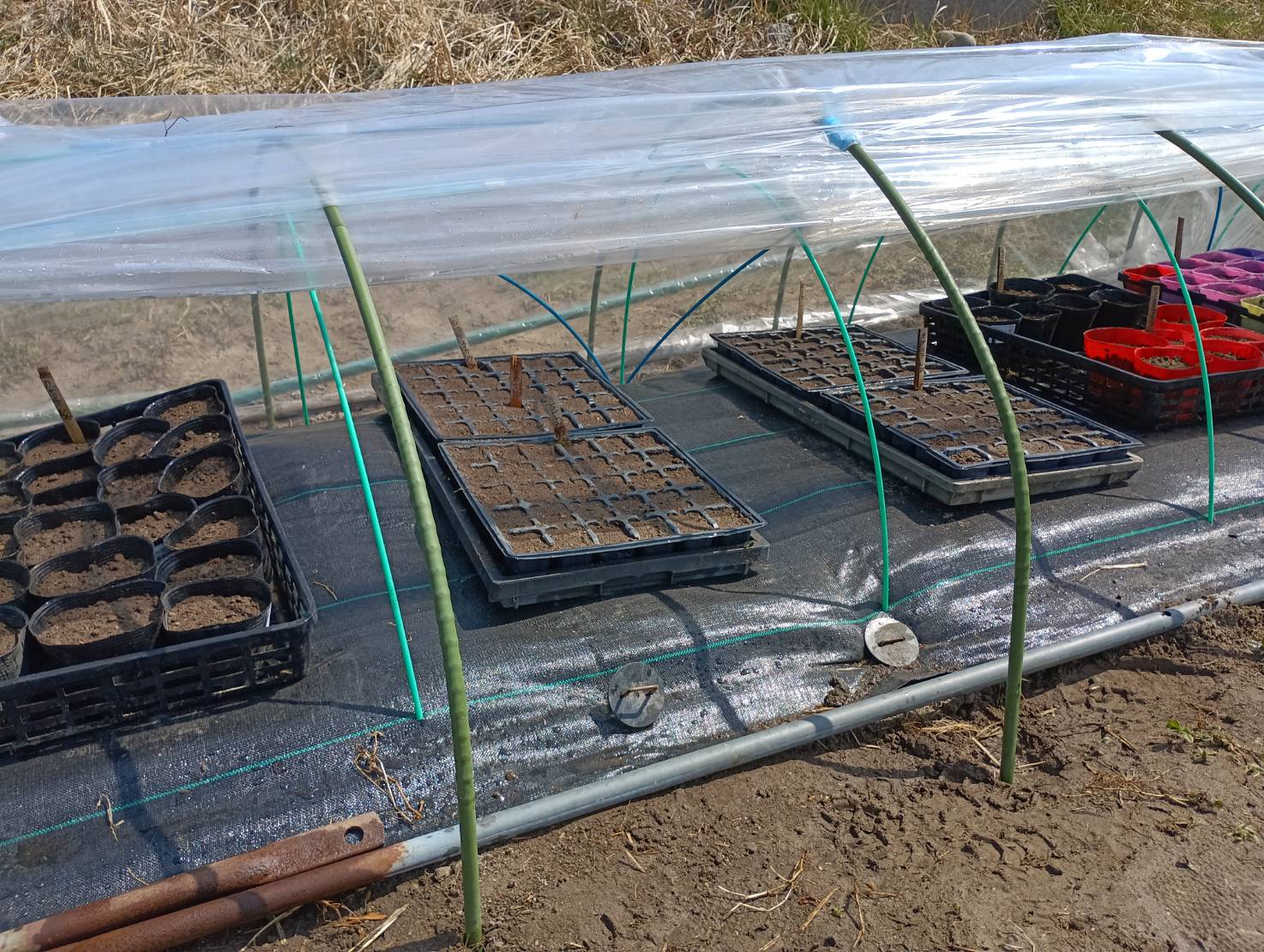 オクラもやはり前記同様にポリポットに蒔きましたが、地温がある程度上がってこないと発芽も生育も芳しくない傾向があるため、4月中下旬に直蒔きする予定でしたが、種もポットも余裕があるので今回はトンネルでの育苗に挑戦しました。