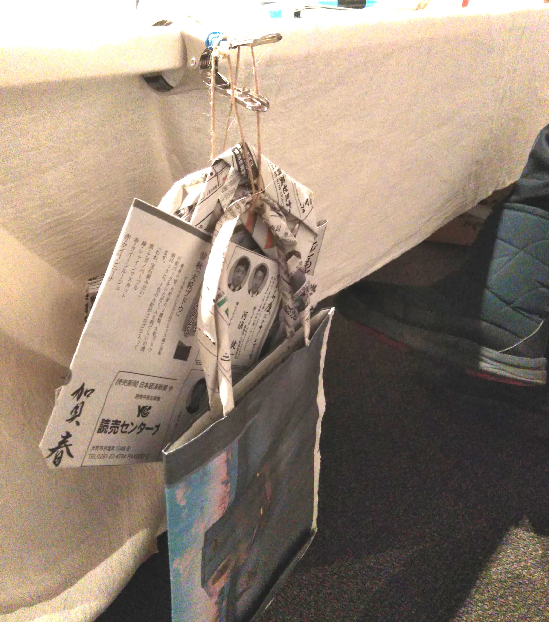 買い物袋の置き方を考えました。S字フックがないので、自分で工夫して紐を使ってかけてみました。